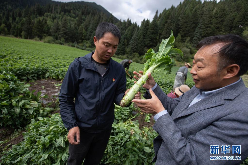 8月13日,在四川省阿壩藏族羌族自治州紅原縣刷經(jīng)寺鎮(zhèn)加當村,農(nóng)業(yè)技術(shù)推廣研究員茍?。ㄇ坝遥┰诓榭词斋@的萵筍生長情況。
