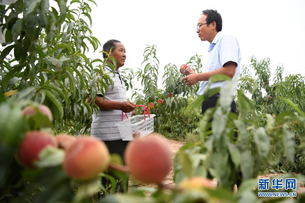 8月18日,方志利(右)和村民交流桃子采摘情況。新華社記者 陳斌 攝