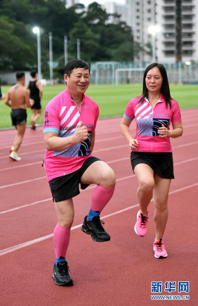 猛龍長跑隊創(chuàng)辦人莫儉榮(左)與領(lǐng)跑員嚴(yán)惠茵訓(xùn)練前進(jìn)行熱身(7月29日攝)。