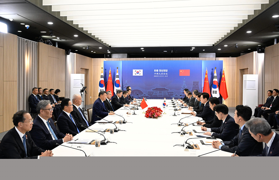 当地时间11月1日下午,韩国总统李在明同中国国家主席习近平在庆州博物馆举行会谈。