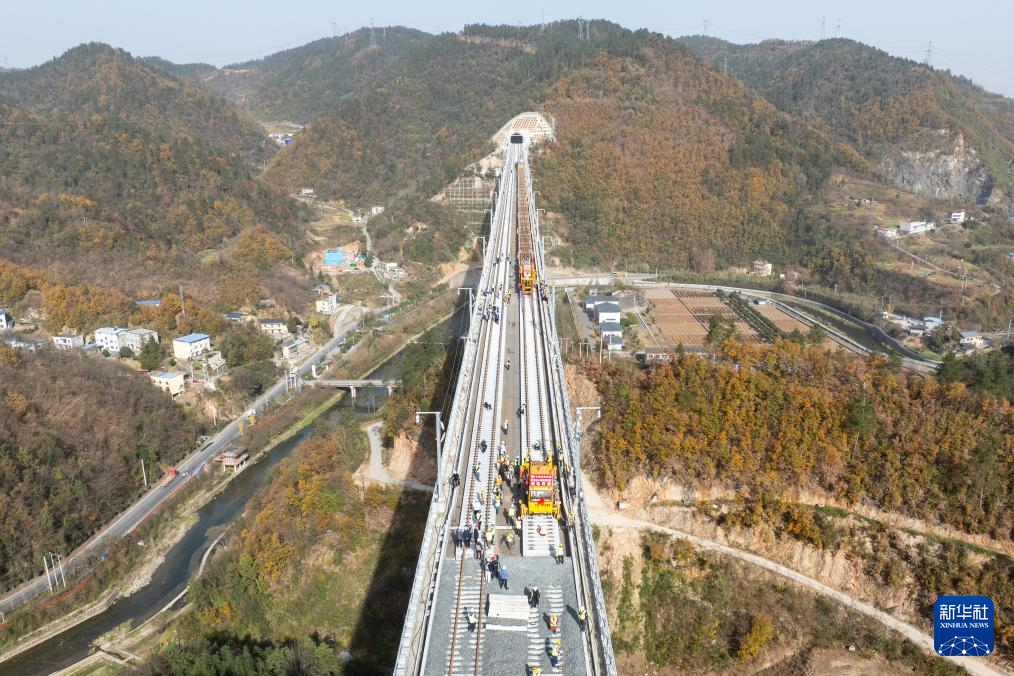 11月27日,在湖北十堰神定河特大桥上,西安至十堰高速铁路(简称“西十高铁”)全线最后一对长钢轨铺设落地,标志着西十高铁全线铺轨工程顺利完工,为后续联调联试奠定基础。