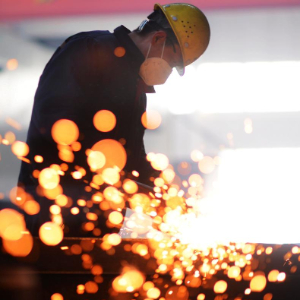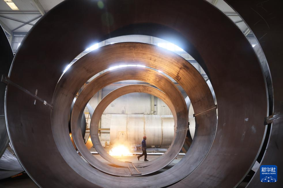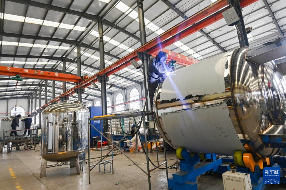 12月16日,在山东省青州市弥河镇一家水处理设备制造企业,工人在进行焊接作业。
