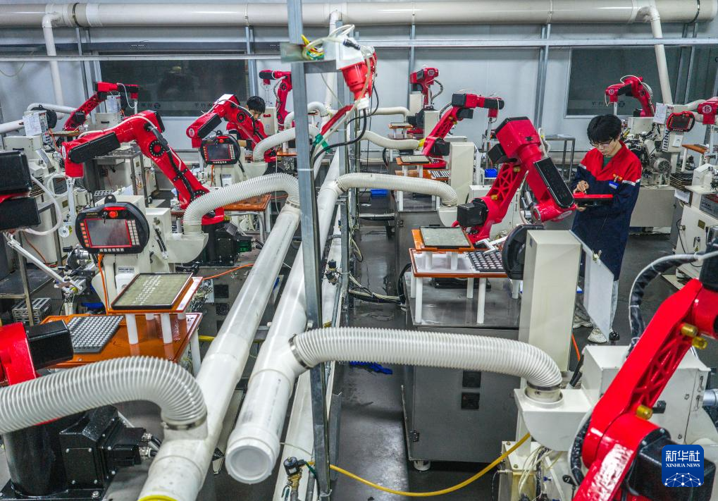 12月16日,在浙江省湖州市德清县雷甸镇的浙江建机德清精益智能工厂,机器臂在进行生产作业。
