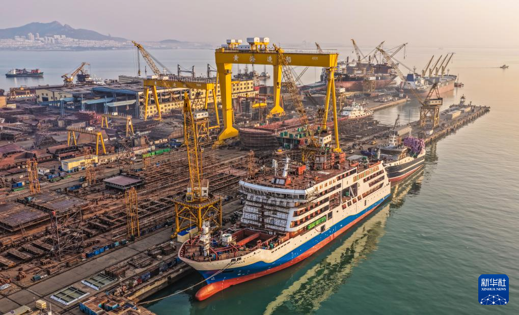 12月16日,在山东省荣成市石岛管理区海工装备产业基地,集装箱货船、大型豪华客货滚装船即将交付客户(无人机照片)。