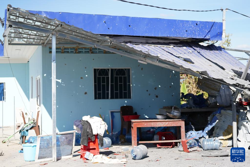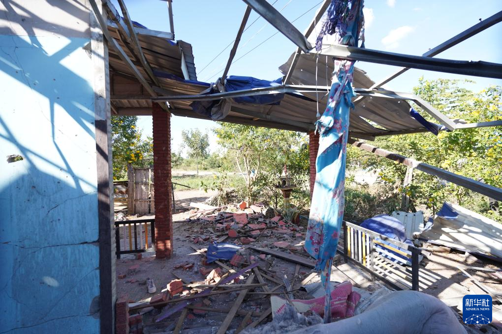 这是12月16日在柬埔寨班迭棉吉省拍摄的一处遭泰军炮击损坏的民房。