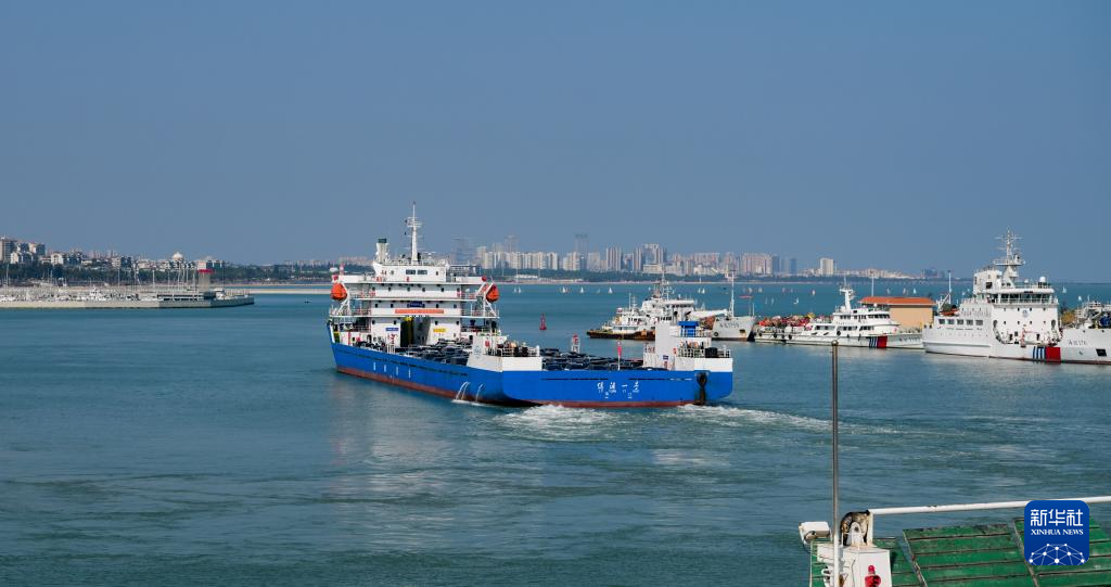 2月21日,在海南省海口市秀英港,新能源汽车专用平板驳船“绿源一号”驶离码头。
