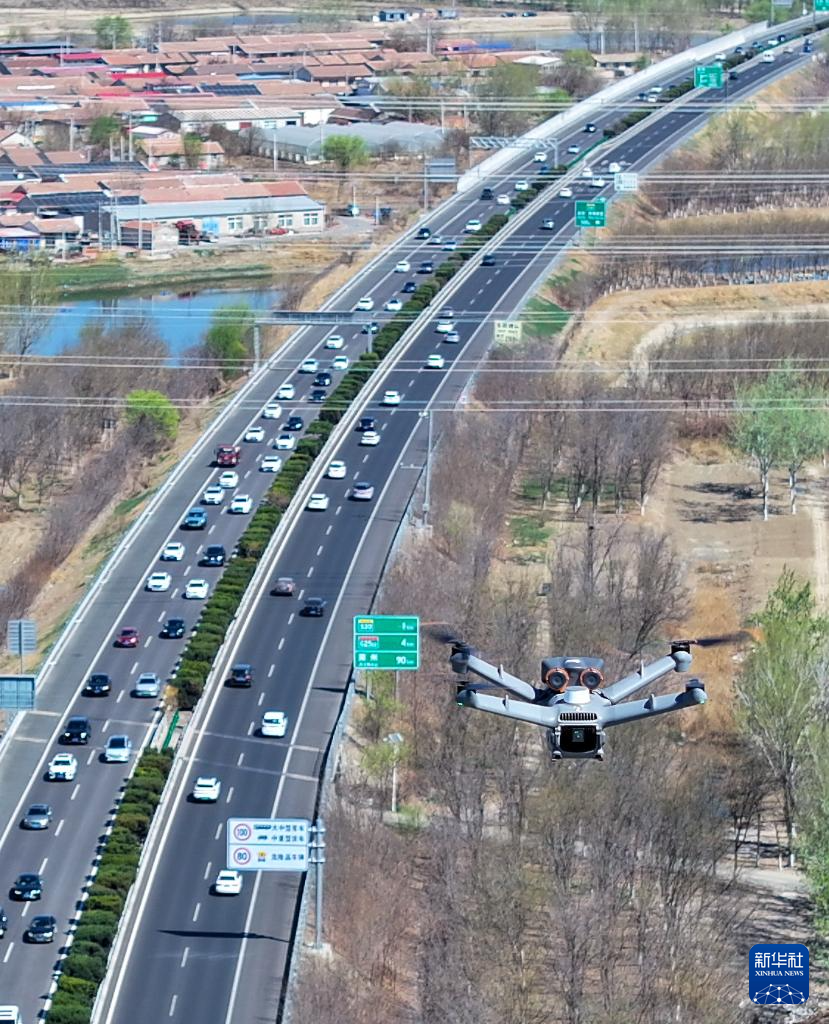 4月6日,天津市公安局交通管理总队高速公路支队采用无人机在津蓟高速上空进行视频定时巡查(无人机照片)。