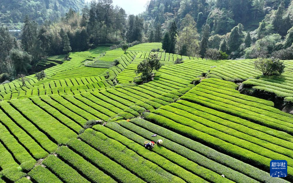 4月9日,湖北省宣恩县椒园镇中坝社区的茶农在采摘春茶(无人机照片)。