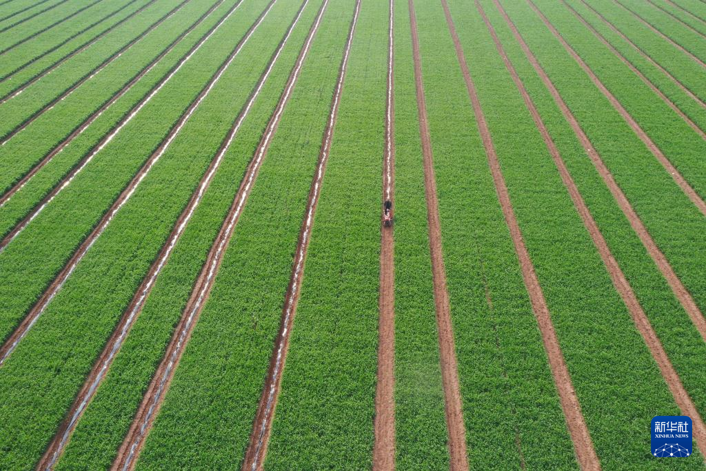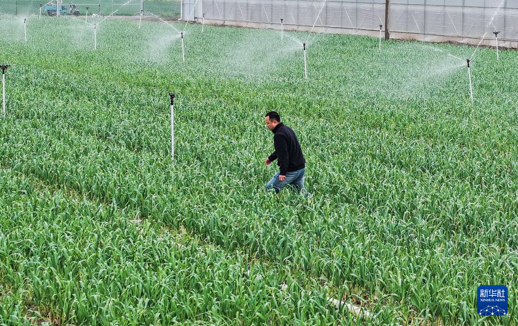 4月9日,在山东省邹平市黛溪街道,农民给大蒜浇水(无人机照片)。