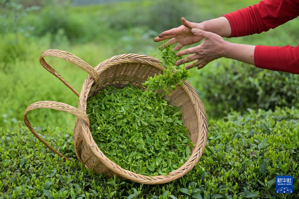4月9日,湖北省宣恩县万寨乡伍家台村茶农将采摘的茶叶放入竹背篓。