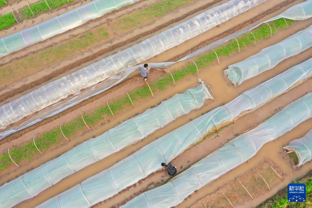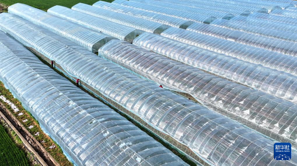 4月9日,在河南省洛阳市汝阳县三屯镇北保村,村民给红薯育苗基地大棚通风(无人机照片)。
