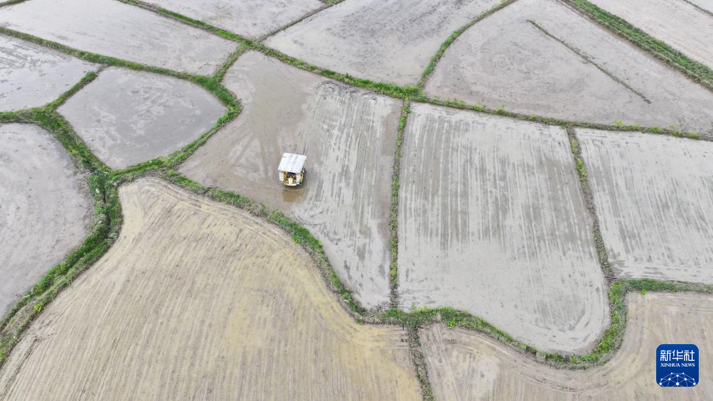 4月8日,在湖南省永州市道县梅花镇车头村,村民驾驶插秧机插早稻(无人机照片)。