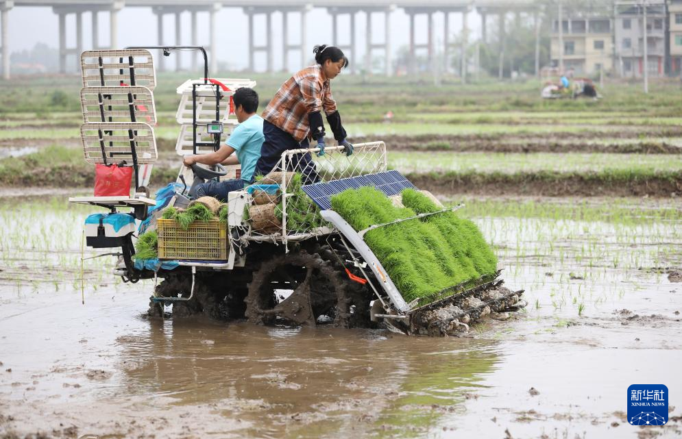 4月8日,在湖南省永州市道县梅花镇车头村,村民驾驶插秧机插早稻。