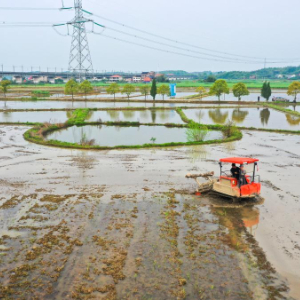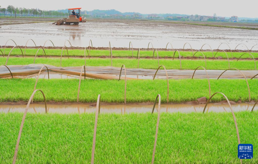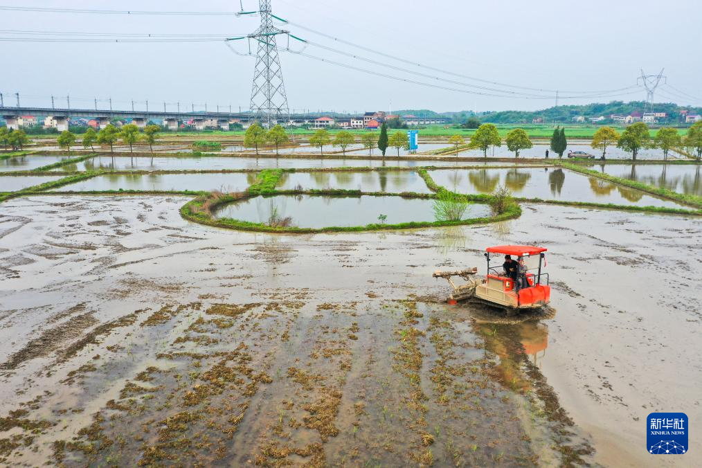 4月9日,在湖南省衡山县白果镇,当地村民驾驶农机翻耕稻田。