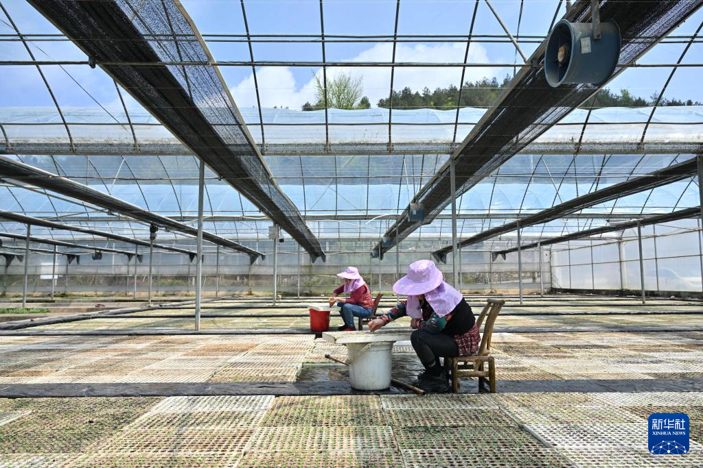 4月9日,在湖北省宣恩县椒园镇锣圈岩社区的水上漂浮育苗大棚里,农民进行间苗作业。