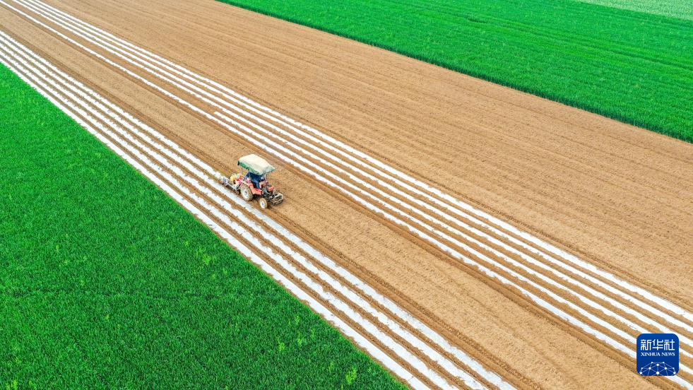4月7日,在河南省沁阳市王曲乡西王曲村,农民使用农机在田间覆盖地膜(无人机照片)。