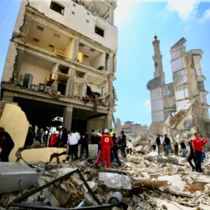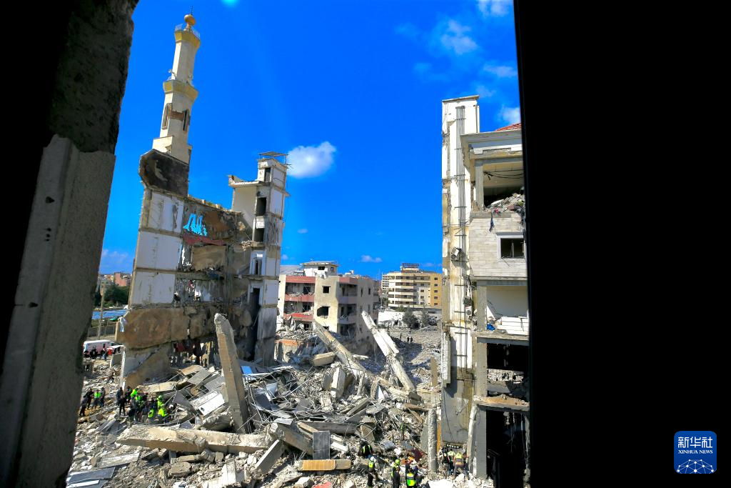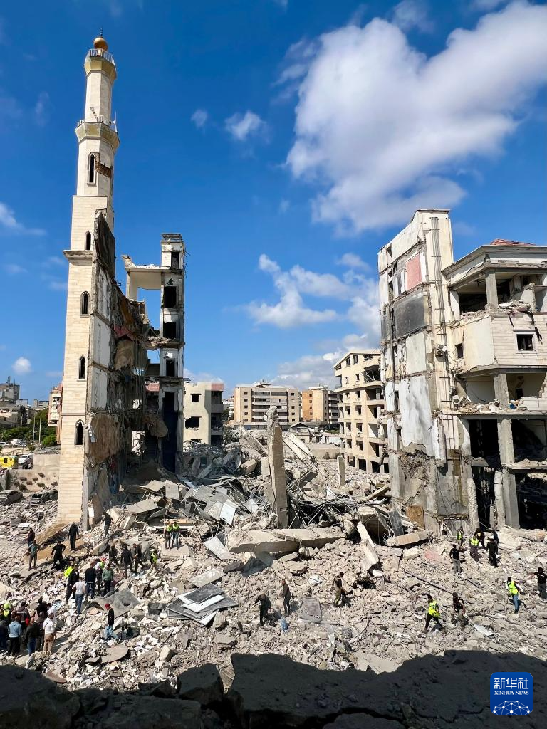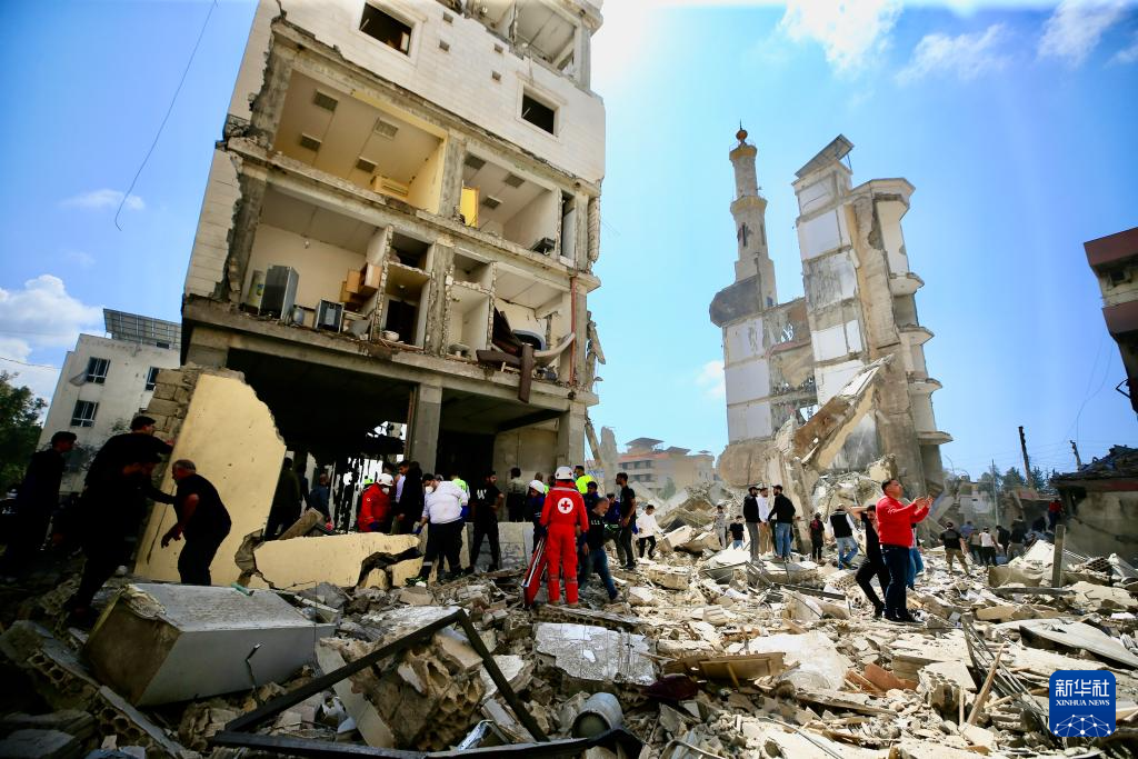 4月8日,在黎巴嫩南部西顿市,救援人员在以军空袭损毁的建筑废墟中寻找生还者。