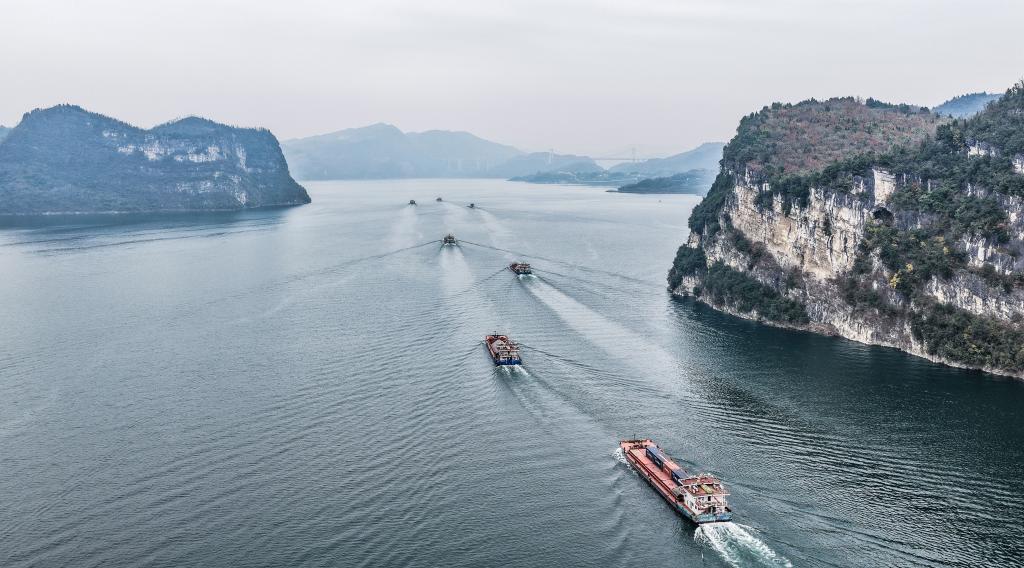 12月16日,随着汽笛长鸣,桥式起重机将装有沉淀硫酸钡的集装箱吊入货船准备起运,贵州省首个自动化港口——瓮安港云中港区正式开港。