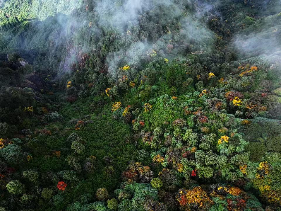 初冬時節(jié),走進云南省騰沖市猴橋鎮(zhèn)輪馬村粉竹壩,層林盡染,五彩斑斕,彩色山林如巨幅油畫鋪展于群山之間。薄霧繚繞中,山林靜謐而幽遠(yuǎn),構(gòu)成一幅濃墨重彩的冬日畫卷。