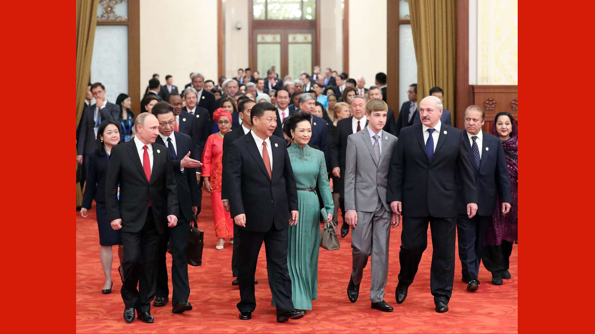 5月14日,國家主席習(xí)近平在北京人民大會(huì)堂舉行宴會(huì),歡迎出席“一帶一路”國際合作高峰論壇的外方代表團(tuán)團(tuán)長(zhǎng)及嘉賓。這是習(xí)近平和夫人彭麗媛同貴賓們一同步入宴會(huì)廳。新華社記者 劉衛(wèi)兵 攝
