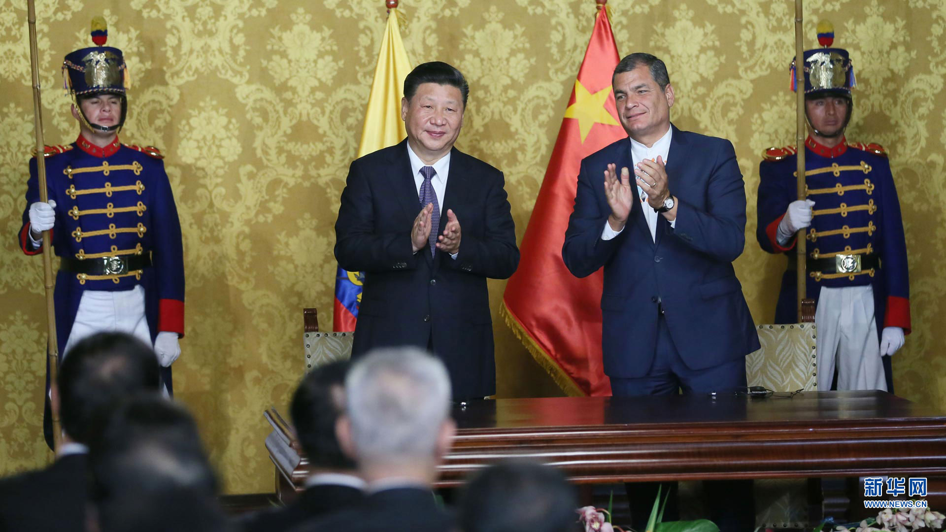 當(dāng)?shù)貢r間11月17日,國家主席習(xí)近平在基多同厄瓜多爾總統(tǒng)科雷亞舉行會談。這是會談后,兩國元首見證雙邊合作文件的簽署。 新華社記者 鞠鵬攝2016-11-18