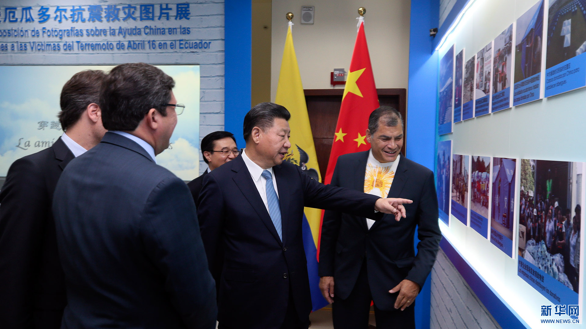 當(dāng)?shù)貢r間11月18日,國家主席習(xí)近平在基多同厄瓜多爾總統(tǒng)科雷亞共同出席中方援建的厄瓜多爾公共安全應(yīng)急指揮中心聯(lián)合實驗室揭牌儀式,喬內(nèi)醫(yī)院奠基、科卡科多-辛克雷水電站竣工發(fā)電視頻連線活動。這是兩國元首共同參觀中方支援厄瓜多爾抗震救災(zāi)圖片展。新華社記者 蘭紅光 攝2016-11-19