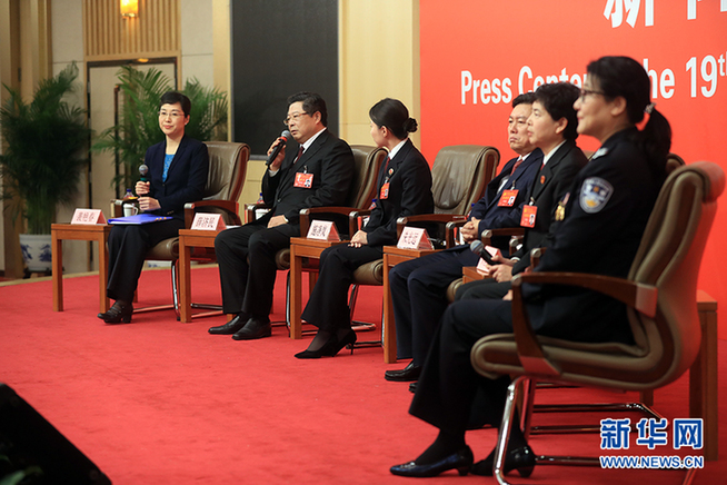 ??? 10月19日,十九大新聞中心舉辦集體采訪,邀請政法戰(zhàn)線代表談推進全面依法治國。圖為采訪現(xiàn)場。新華網(wǎng) 郝廣鵬攝