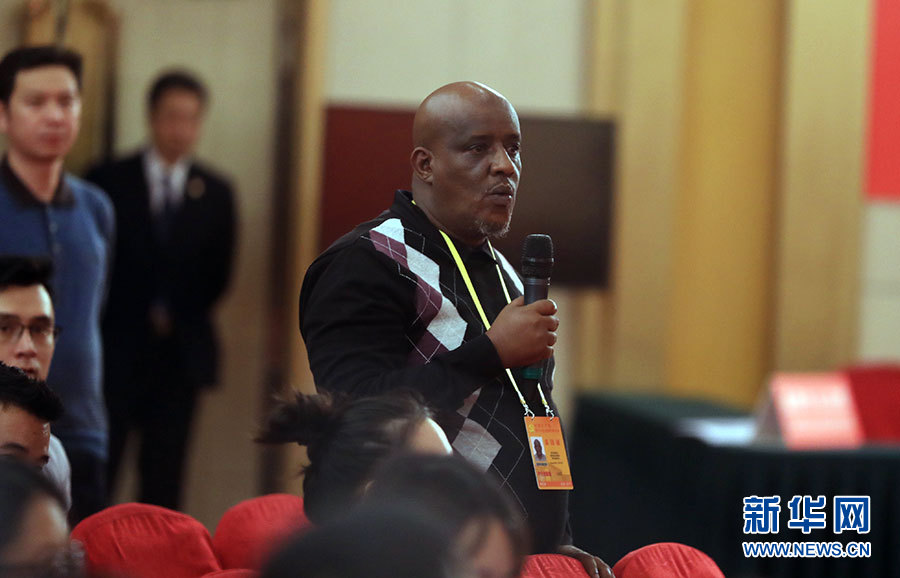 ??? 10月19日,十九大新聞中心舉辦集體采訪,邀請(qǐng)政法戰(zhàn)線代表談全面推進(jìn)依法治國。圖為肯尼亞記者提問。新華網(wǎng) 郝廣鵬攝