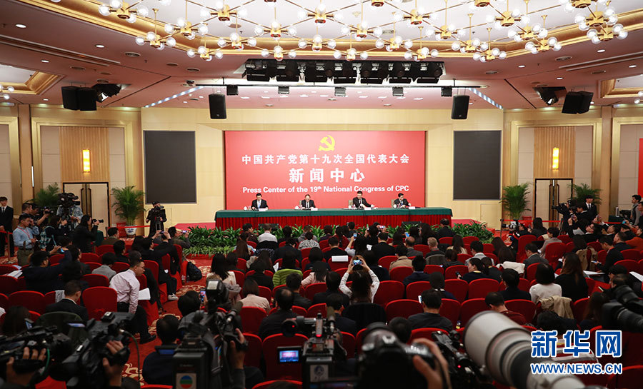 10月21日,十九大新聞中心舉辦記者招待會,邀請中共中央統(tǒng)戰(zhàn)部常務(wù)副部長張裔炯、副部長冉萬祥,中共中央對外聯(lián)絡(luò)部副部長郭業(yè)洲介紹黨的統(tǒng)一戰(zhàn)線工作和黨的對外交往情況,并回答記者提問。圖為記者招待會現(xiàn)場。新華網(wǎng) 郝廣鵬攝