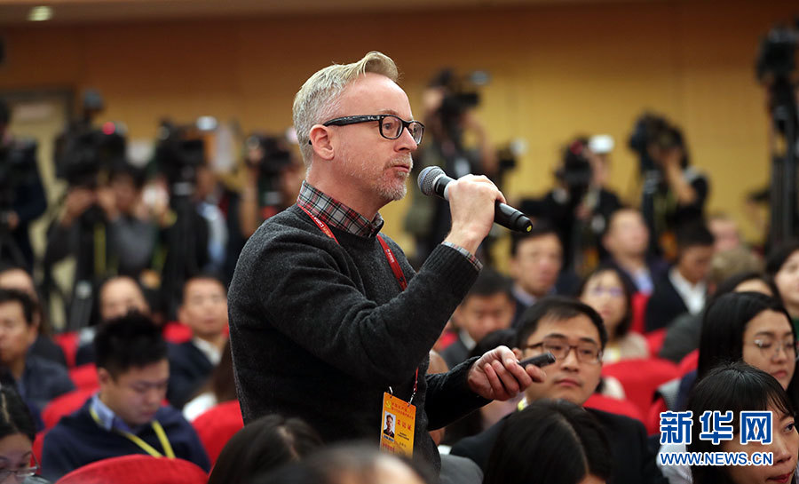 10月21日,十九大新聞中心舉辦記者招待會,邀請中共中央統(tǒng)戰(zhàn)部常務(wù)副部長張裔炯、副部長冉萬祥,中共中央對外聯(lián)絡(luò)部副部長郭業(yè)洲介紹黨的統(tǒng)一戰(zhàn)線工作和黨的對外交往情況,并回答記者提問。圖為美聯(lián)社記者提問。新華網(wǎng) 郝廣鵬攝