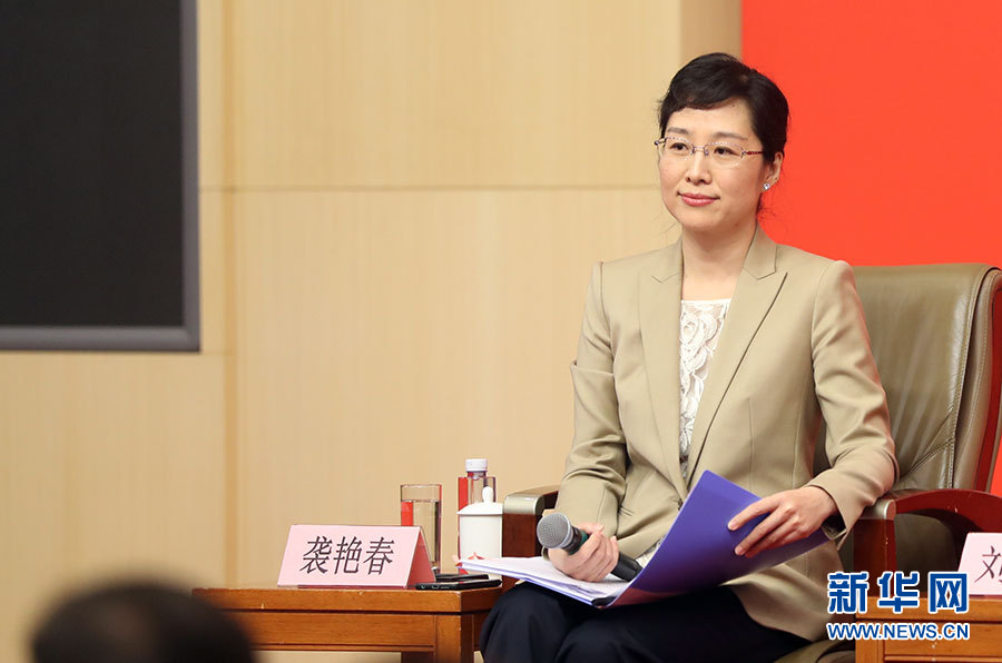 10月22日,十九大新聞中心在梅地亞中心二層新聞發(fā)布廳舉辦集體采訪活動,主題為“中國特色強(qiáng)軍之路邁出堅定步伐”。圖為主持人襲艷春。新華網(wǎng) 郝廣鵬攝