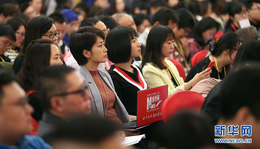 10月23日,十九大新聞中心舉辦記者招待會(huì),邀請(qǐng)中央財(cái)經(jīng)領(lǐng)導(dǎo)小組辦公室副主任楊偉民,環(huán)境保護(hù)部黨組書記、部長李干杰介紹踐行綠色發(fā)展理念,建設(shè)美麗中國有關(guān)情況,并回答記者提問。圖為現(xiàn)場記者。新華網(wǎng) 郝廣鵬攝