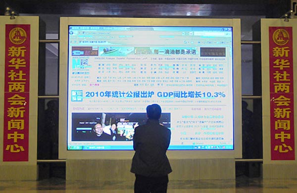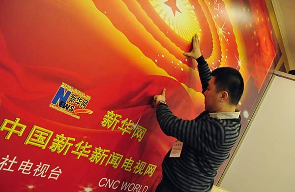 3月1日,新華網(wǎng)兩會報(bào)道人員正在布置工作間。第十一屆全國人民代表大會第四次會議、全國政協(xié)十一屆四次會議即將開幕。