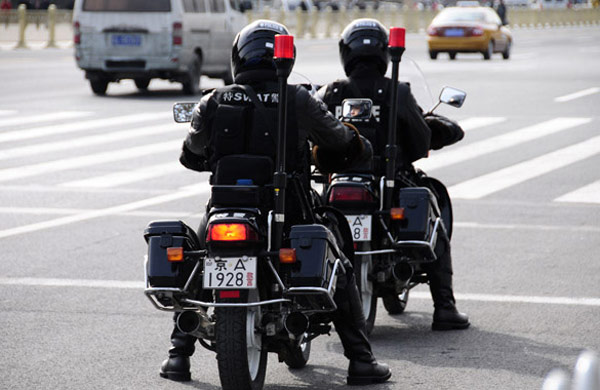 3月1日,特警隊(duì)員在人民大會堂東門外巡邏。十一屆全國人大第四次會議、全國政協(xié)十一屆四次會議即將開幕。