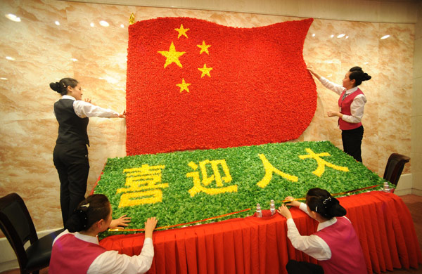 3月2日,京西賓館的服務(wù)員用絹花拼出國旗和“喜迎人大”的圖案。當(dāng)日,為了迎接全國人大代表入住,京西賓館的服務(wù)員自發(fā)設(shè)計(jì),并從市場上采購來絹花,在餐廳拼出組合圖案,表達(dá)“喜迎人大”的心情。