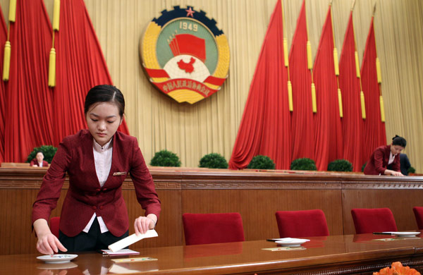 3月3日,人民大會堂的工作人員在布置會場。當(dāng)日15時(shí),中國人民政治協(xié)商會議第十一屆全國委員會第四次會議將在北京人民大會堂開幕。