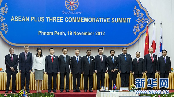 ????新華網(wǎng)金邊11月19日電(記者劉華 馮堅 王其冰)東盟與中日韓(10+3)合作15周年紀念峰會19日在柬埔寨金邊舉行。中國國務(wù)院總理溫家寶與東盟十國、日本、韓國領(lǐng)導人共同出席。柬埔寨首相洪森主持會議。
