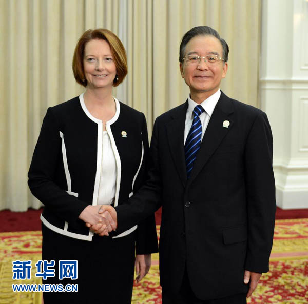 11月20日,國(guó)務(wù)院總理溫家寶在金邊會(huì)見澳大利亞總理吉拉德。新華社記者張鐸攝