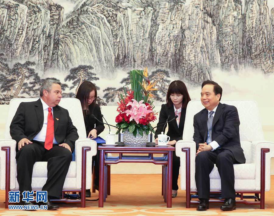 ??? 4月8日,中共中央政治局委員、中華全國(guó)總工會(huì)主席李建國(guó)在北京會(huì)見(jiàn)古巴國(guó)務(wù)委員會(huì)委員、古共中央委員、古巴工人中央工會(huì)總書(shū)記吉拉特。新華社記者丁林?jǐn)z