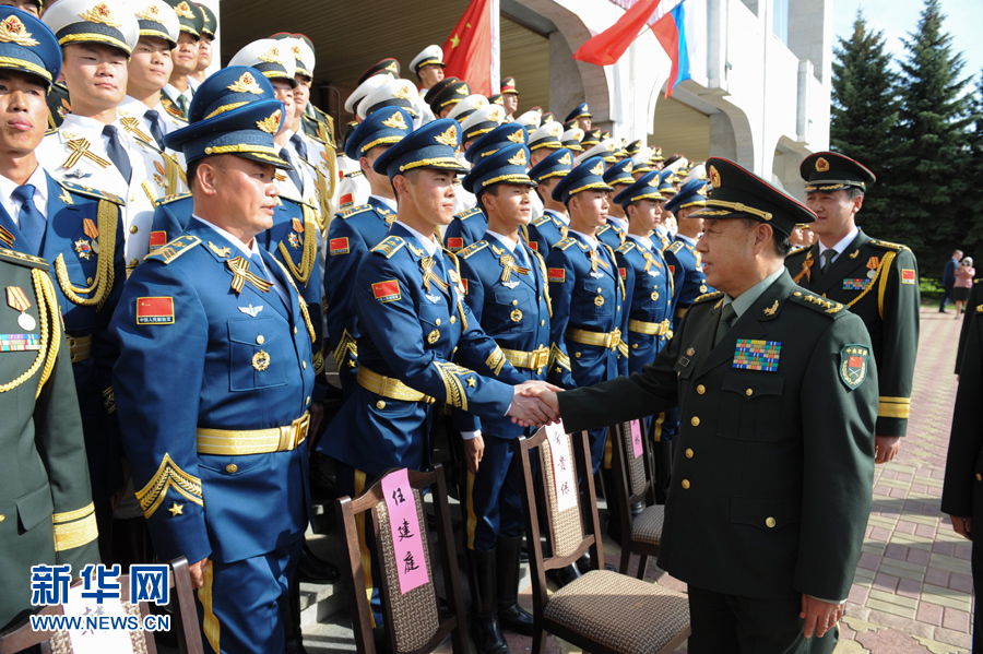 ??? 5月9日,在俄羅斯首都莫斯科,中共中央政治局委員、中央軍委副主席范長(zhǎng)龍看望中國(guó)人民解放軍三軍儀仗隊(duì)官兵。受習(xí)近平主席委托,中共中央政治局委員、中央軍委副主席范長(zhǎng)龍9日下午來(lái)到參加俄羅斯紀(jì)念衛(wèi)國(guó)戰(zhàn)爭(zhēng)勝利70周年慶典的我軍閱兵方隊(duì)駐地看望官兵,代表習(xí)主席和中央軍委向方隊(duì)官兵圓滿完成參閱任務(wù)表示祝賀,勉勵(lì)他們認(rèn)真總結(jié)經(jīng)驗(yàn),牢記強(qiáng)軍目標(biāo),獻(xiàn)身強(qiáng)軍實(shí)踐,為黨和人民再立新功。新華社記者戴天放攝??