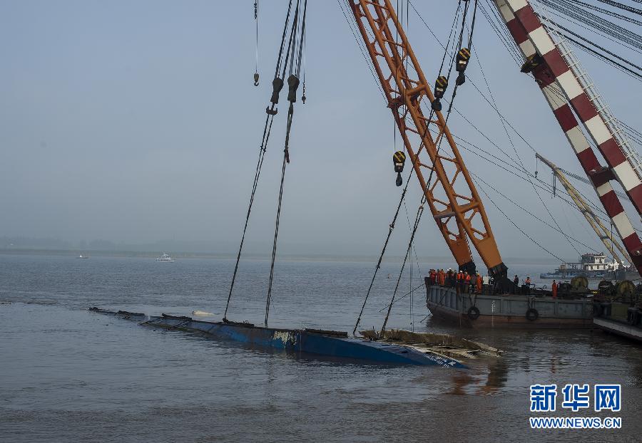 新華網(wǎng)湖北監(jiān)利6月5日電(記者皮曙初、王賢)記者在“東方之星”沉船施救現(xiàn)場看到,7時40分,“東方之星”船體已側翻過來,露出“東方之星”四個大字,藍色的船體也已露出水面。