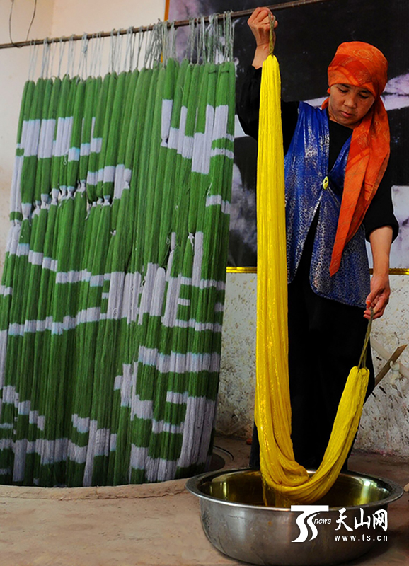而今,這種技法漸漸被注入新鮮血液。6月底,當(dāng)記者走進(jìn)吉亞鄉(xiāng)喀了塔吐格曼村家庭作坊,在院子里看見正在染色的艾比比班 卡斯木。一蘸、一染、一擰、一轉(zhuǎn),一套動(dòng)作下來就能浸染一小段艾德萊斯了,有了現(xiàn)成的絲線和染料后,這項(xiàng)神秘扎染技藝顯得更加快捷了,村民們也樂于接受這種高效的生產(chǎn)模式。
