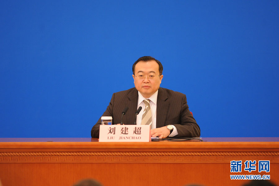 ????3月15日,國務(wù)院總理李克強(qiáng)在人民大會(huì)堂三樓金色大廳會(huì)見采訪十二屆全國人大三次會(huì)議的中外記者并回答記者提出的問題。圖為外交部部長助理兼新聞司司長劉建超。新華網(wǎng)/中國政府網(wǎng) 翟子赫 攝