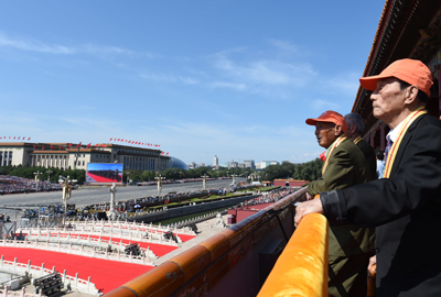 “九三閱兵”這天,李占瑞被安排在天安門城樓的第一排。雖然經(jīng)過了前兩天的車馬勞頓和活動(dòng)安排,李占瑞依舊神采奕奕?!疤彀查T第一排有我的座位,還寫著我的名字。我扶著欄桿,上面下面都看見了,看的很清楚。開始是直升機(jī),有200多架,后來是戰(zhàn)斗機(jī)、轟炸機(jī)、運(yùn)輸機(jī),還有無人駕駛飛機(jī)。我都看到了。還有導(dǎo)彈,無數(shù)的導(dǎo)彈。這都是國家的國防武器,可以防止敵人侵略呀!”李占瑞爬滿褶皺的臉上閃著光。