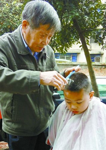 推、梳、刷、刮……很快,一個漂亮的小平頭剪好了。當?shù)鼐用駝娂敉觐^發(fā),摸摸頭,滿意地向梁老致謝,并給老人遞上1塊錢。今年76歲的梁志高,這已經(jīng)是他義務(wù)為群眾理發(fā)的第52個春秋。