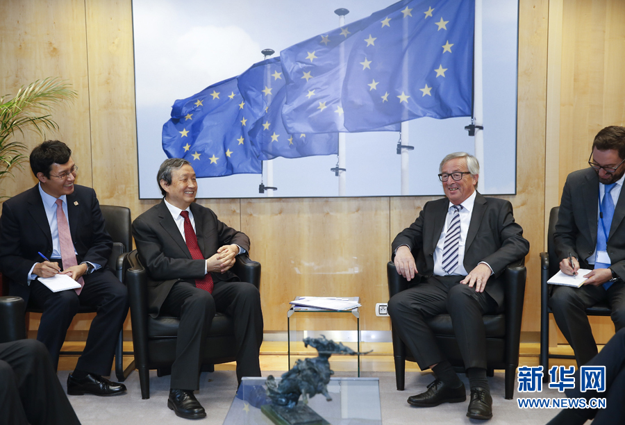 10月18日,在比利時首都布魯塞爾歐盟委員會總部,出席第六次中歐經(jīng)貿(mào)高層對話的國務(wù)院副總理馬凱(左二)會見歐盟委員會主席容克(右二)。新華社記者葉平凡攝