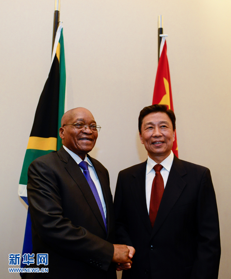 11月22日,南非共和國(guó)總統(tǒng)、非洲人國(guó)民大會(huì)主席雅各布·祖馬(左)在開普敦會(huì)見(jiàn)應(yīng)邀訪問(wèn)的中國(guó)國(guó)家副主席李源潮。 新華社記者翟健嵐攝