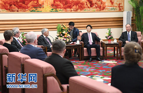 11月25日,中共中央政治局委員、中央政法委書(shū)記孟建柱在北京會(huì)見(jiàn)中英法治圓桌會(huì)議英方代表。 新華社記者謝環(huán)馳攝