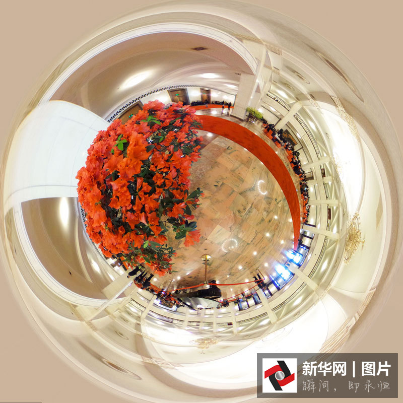 ??? 兩會(huì)期間,人民大會(huì)堂里溫暖如春,杜鵑花、迎春花等春花競(jìng)相開放,記者用360度球形全景的特殊視角展現(xiàn)人民大會(huì)堂里春花開放的美景。圖片來(lái)源:視覺中國(guó)