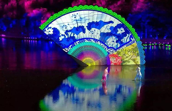 2016年9月4日晚,一場名為“最憶是杭州”的文藝演出在杭州西子湖畔進(jìn)行室外表演。隨著《春江花月夜》《采茶舞曲》帶著中國傳統(tǒng)文化的韻律登臺(tái)表演,360度巨型圓扇在水面上完美地映射出來,點(diǎn)燃了文藝晚會(huì)的高潮。